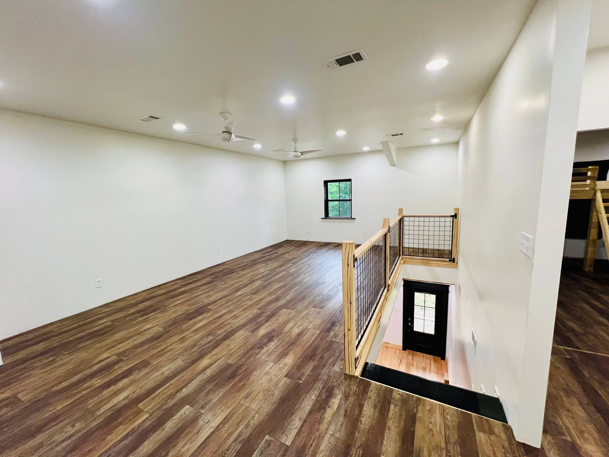 The living area is anchored by a cozy wood-burning Buck Stove, adding rustic charm and warmth. Comfort is further ensured with two central HVAC units (one for each level) and a tankless water heater. Upstairs, you’ll find two bedrooms, two full baths, a large bonus room, and three spacious walk-in closets. The downstairs master suite includes a massive walk-in closet and a private bath with tile materials on-site, ready to be installed.